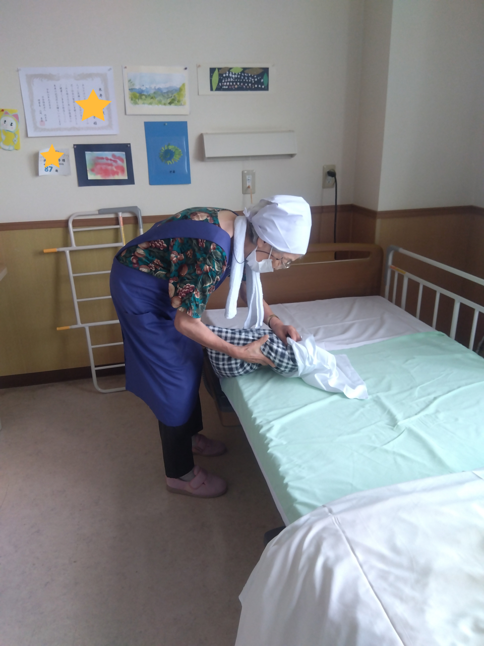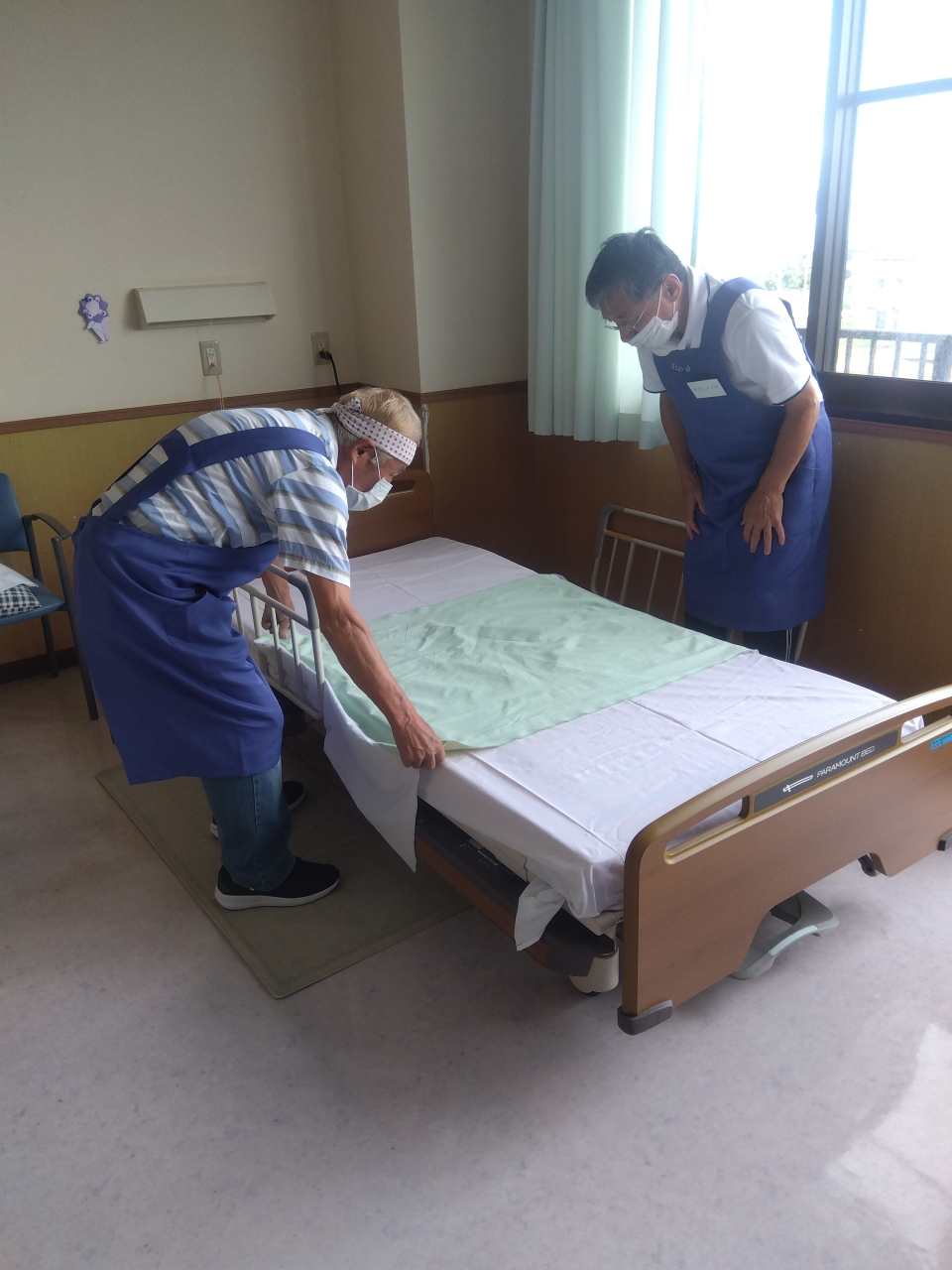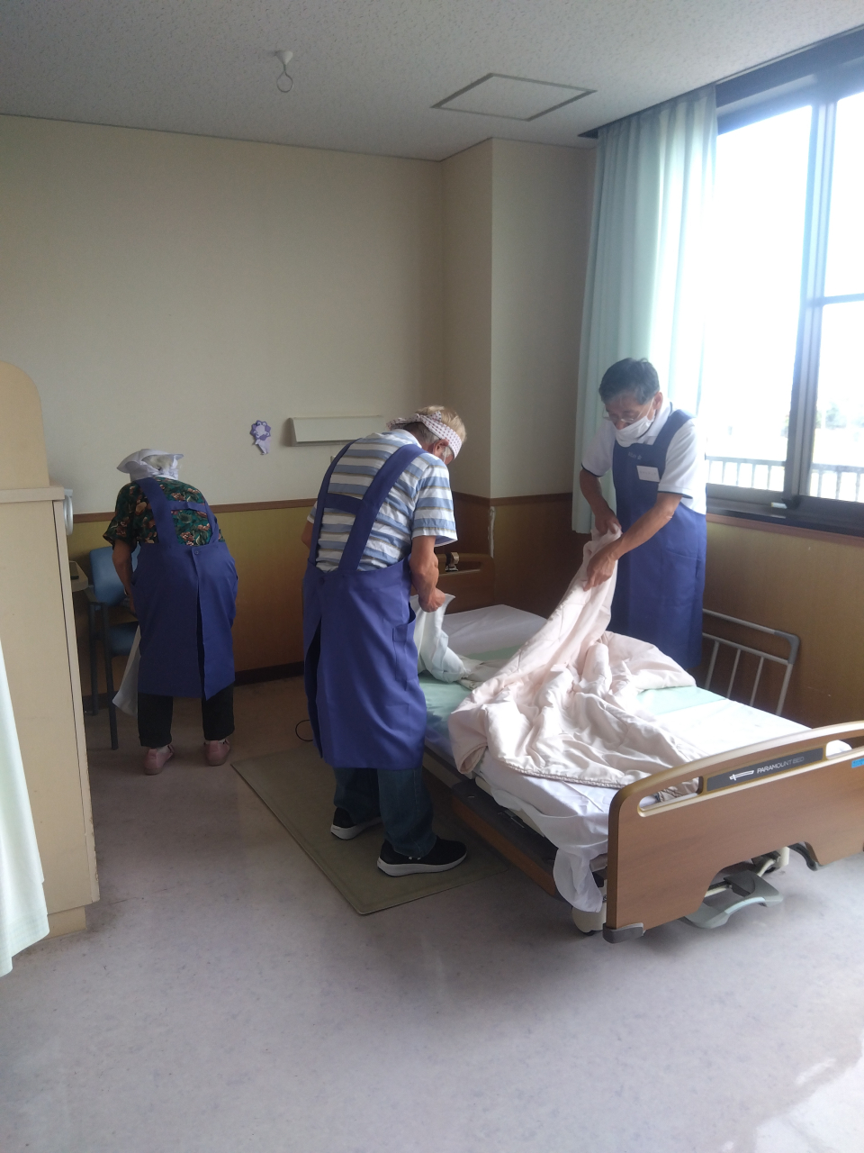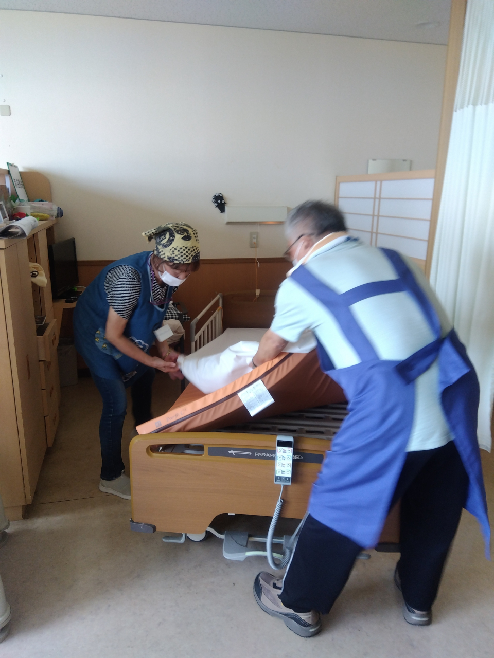 毎月第1水曜日に、はとの会の方々に、シーツ張りのボランティアに来ていただいています。