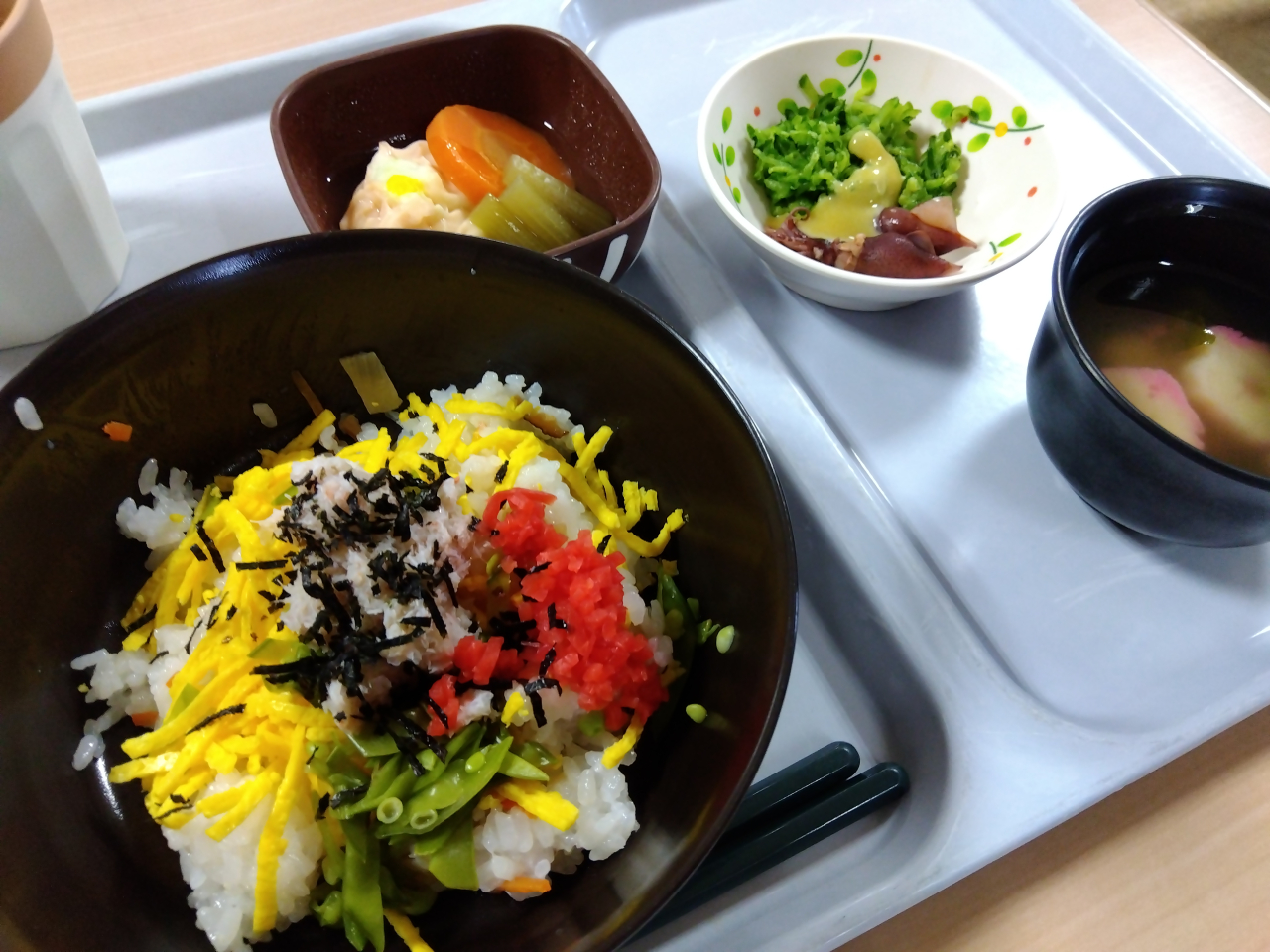 4月に入った初日の昼食に、春の訪れを感じる、華やかなちらし寿司が新登場!蟹の身がのった、色鮮やかな具材を散りばめた一品。